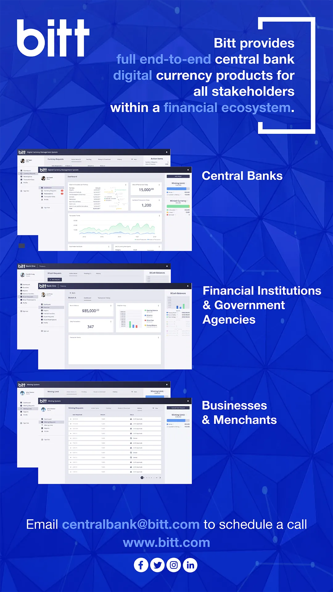 Bitt Inc. (Bitt) is a financial technology company that provides digital currency solutions to central banks, financial institutions and financial ecosystem participants worldwide. Bitt specializes in the development, customization, and integration of secure financial technology solutions, including digital currency infrastructure and management applications.